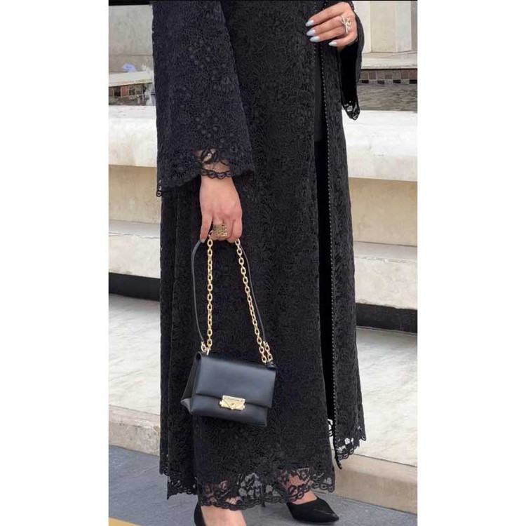مانتو مشکی دانتل با طراحی ظریف و پارچهی گیپور درجهیک، انتخابی خاص برای بانوانی است که به دنبال استایلی شیک و باوقار هستند. آستر داخلی این مانتو باعث راحتی بیشتر در پوشش شده و تزئین مرواریدی روی لبهی جلو، جلوهای لوکس و خاص به آن بخشیده است. این مانتو انتخابی ایدهآل برای مهمانیها و مجالس رسمی به شمار میآید.
